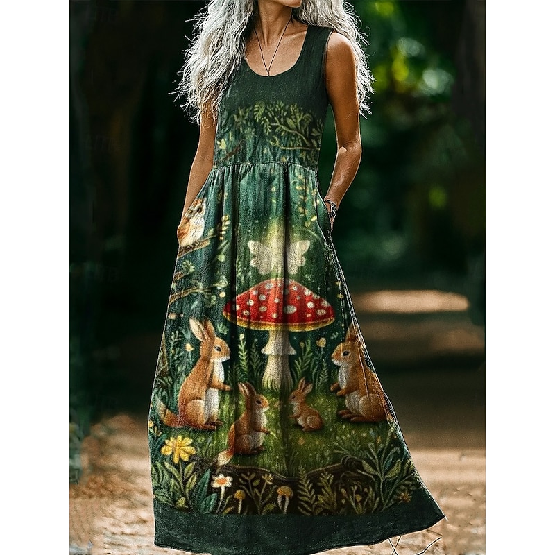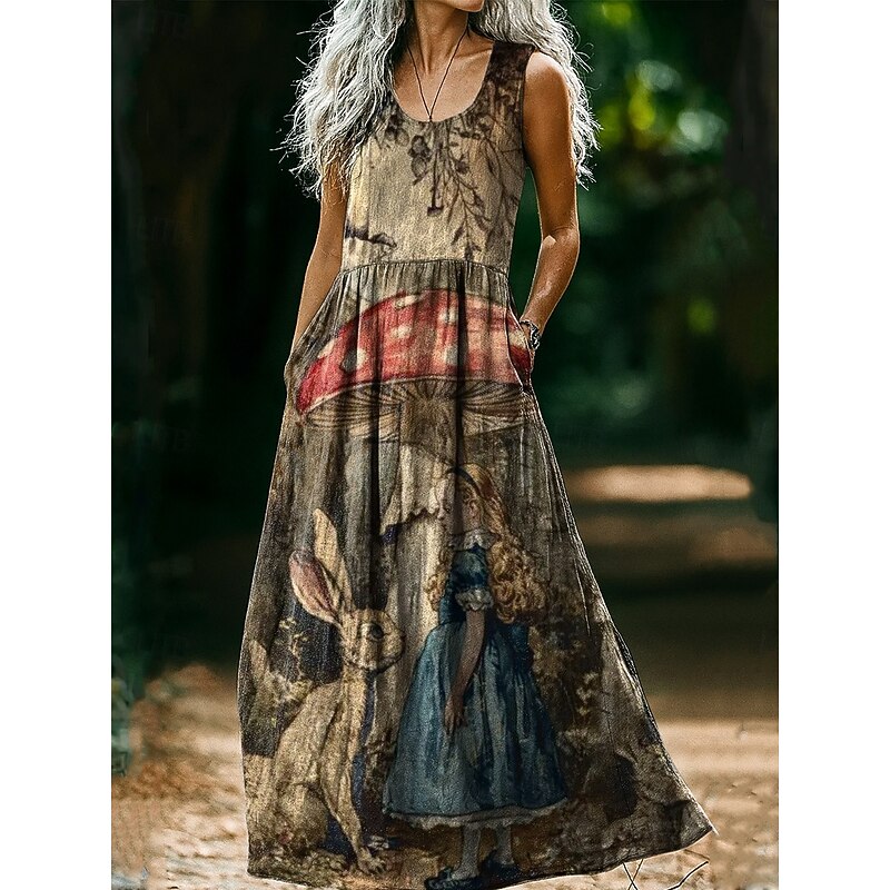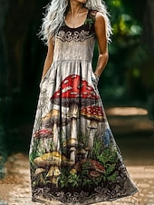 HOT ! Women's Vintage Round Neck Bohemian Ethnic Mushroom Dress Slip Dress Pleated Casual Boho Party Going out Beach Regular Fit Floral Graphic Abstract Sleeveless