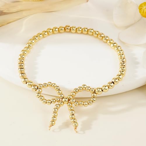 HOT ! Dainty Gold Beaded Bow Bracelet for Women,Handmade Boho 14K Gold Plated Bead Bowknot Stretch Bracelet Cute Prom Jewelry Gift