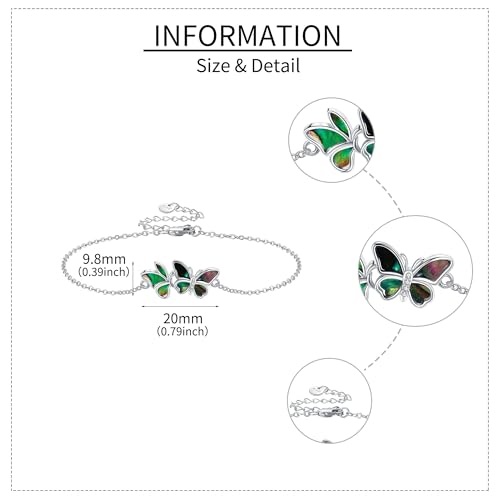 Material: Sterling SilverMetal type: Sterling SilverGem type: No gemstoneItem type name: BraceletsUnique Design: butterflies represent resilience, change, hope, and life. The two butterflies on the bracelet are light and smart. The delicate abalone shell butterfly adds a dainty element to this feminine designMaterial: The abalone butterfies bracelet are made of 925 sterling silver, nickel-free, lead-free, hypoallergenicSize: The size is of this sterling silver butterfly bracelet for women is 7+2 in, adjustable, suitable for most womenElegant Chioce: This is the best chioce for ladies who love butterflies! At the same time, these butterfly jewelry for women mum will be the wonderful chioce for your wedding, anniversary, and birthday.Occasions: It suits for almost every occasions, no matter on parties, Birthday, Anniversary, Mothers day, Valentines, Christmas, daily wearing or some other occasions Perfect for everyday use. High quality materials and excellent craftsmanship ensure long-lasting durability.