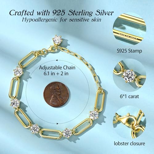 Item display length: 6.1 inchesMaterial: Sterling SilverMetal type: Sterling SilverClasp type: Spring RingChain type: Link ChainMetal weight: 5.92 ouncesD COLOR MOISSANITE SPARKLE - Adorned with 6.5mm x 6pc D color moissanite stones, this link bracelet shines with exceptional brilliance and clarity. Each moissanite is handpicked to ensure consistent fire and sparkle, creating a continuous line of radiance that catches light from every angle, making it a striking accessory.STYLISH LINK DESIGN - The link bracelet style with 6 moissanite stones blends modern charm with versatility. It’s designed to complement a range of outfits, from casual to formal, adding a touch of elegance to any look, perfect for women who value both style and functionality.DURABLE 925 STERLING SILVER - Crafted from high-quality 925 sterling silver, the moissanite link bracelet offers durability and a sleek, polished finish. The silver setting securely holds each moissanite, ensuring long-lasting wear and maintaining its luster with proper care, perfect for daily use or special occasions.VERSATILE FOR EVERY WOMAN - Whether for a wife, mom, or yourself, these 925 silver link bracelet are a versatile addition to any jewelry collection. They complement both casual and formal looks, making them a great choice for daily wear, parties, or as a thoughtful gift for loved ones.ADJUSTABLE LENGTH FOR COMFORT - With a 6.1+2 adjustable chain, this link bracelet provides a customizable fit for different wrist sizes. Whether you prefer a snug or looser fit, the adjustable design ensures comfort and versatility, making it easy to wear all day. Perfect for everyday use. High quality materials and excellent craftsmanship ensure long-lasting durability.