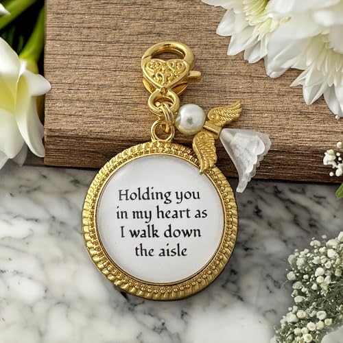More information about Wedding Bouquet Memorial Remembrance Charm with Angel and Quote Charm in my Heart as I Walk Down the Aisle Clip on Memory Wedding Day Bright Gold