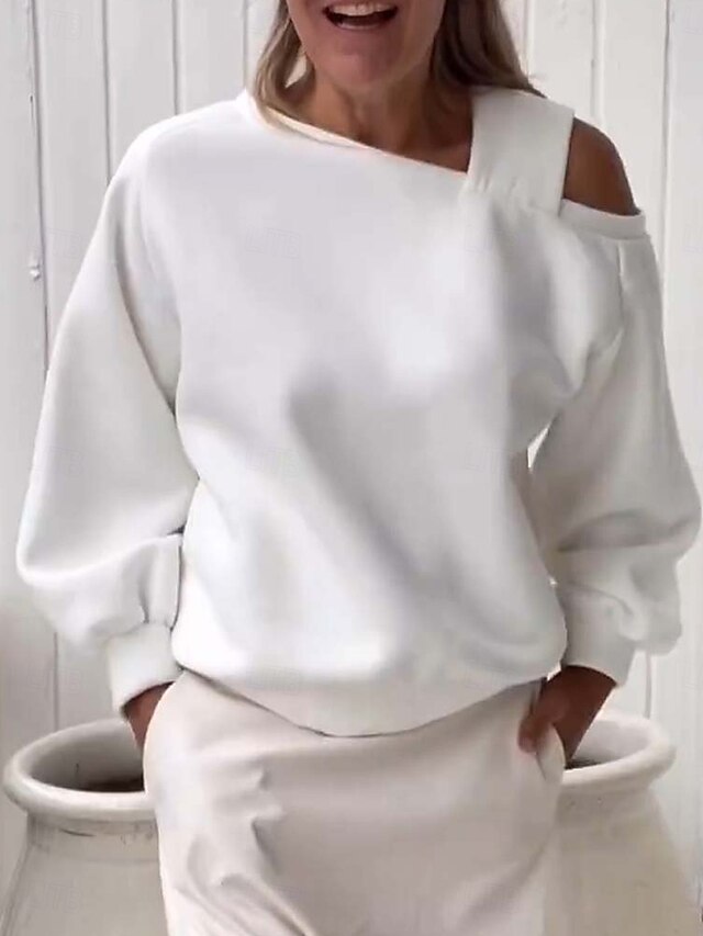 Highlights [Fabric] : Crafted from premium polyester, this women's sweatshirt offers a soft, micro-elastic feel that ensures both comfort and ease of movement. The lightweight material makes it ideal for layering in fall and winter. [Fit] : Featuring a regular fit, this sweatshirt is perfect for casual outings or relaxed settings. The slightly puffed long sleeves with fitted cuffs create a trendy silhouette, while the V-neckline adds a touch of elegance. [Design Highlights] : This sweatshirt showcases a modern asymmetrical design with one-shoulder detail, providing a chic flair. Its crisp white color enhances its versatility, making it suitable for pairing with a variety of bottoms and accessories. [Occasions] : Ideal for daily wear and street style, this sweatshirt is perfect for transitioning from casual daywear to slightly more formal occasions, ensuring you stay stylish and comfortable throughout the seasons. [Size Notice] : Available in a variety of sizes ranging from S to 2XL, catering to different body types and preferences. Perfect for everyday use. High quality materials and excellent craftsmanship ensure long-lasting durability.