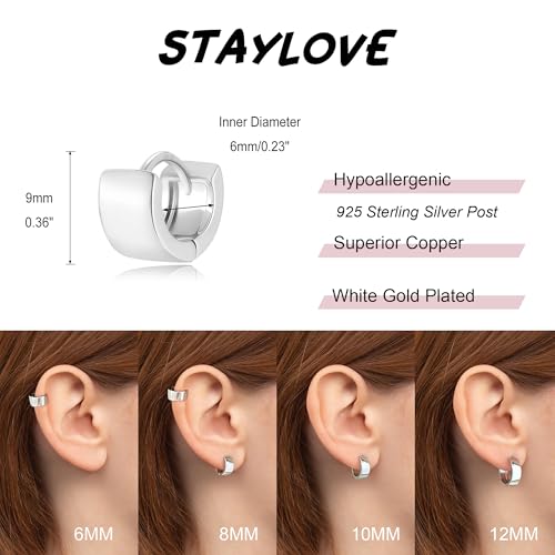 Material: Sterling Silver, CopperMetal type: Sterling Silver, CopperBack Finding: Hinged HoopEarring design: HoopGem type: No GemstoneComfortable Wearing: Dainty small gold hoop earrings with sturdy flexible clasp, easy to wear and take off. The chunky huggie earrings with 20 gauge 925 sterling silver post are suitable for everyday wearQuality Material: Trendy small huggie hoop earrings are made of superior copper, 14k real gold plated, nickel free, lead-free, Lightweight and hypoallergenic hoop earrings are suitable for sensitive earsSuitable Size: Mini 5mm wide hoop earrings are 6/8/10/12mm in inner diameter, you can choose different size small hoop earrings according to your needs, it can easily match with most of your outfitsMulti Purpose: Simple chunky gold hoop earrings feature a classic wide design, high polished, Small gold hoops of various sizes can be stacked on earlobe, helix and cartilage, or with other piercing earringsPretty Package: Each STAYLOVE jewelry is packed in a exquisite box. Good jewelry presents for your family and friends on Birthday, Mother's Day, Anniversary, Christmas, Wedding, Party, Office or Daily life etc. Perfect for everyday use. High quality materials and excellent craftsmanship ensure long-lasting durability.