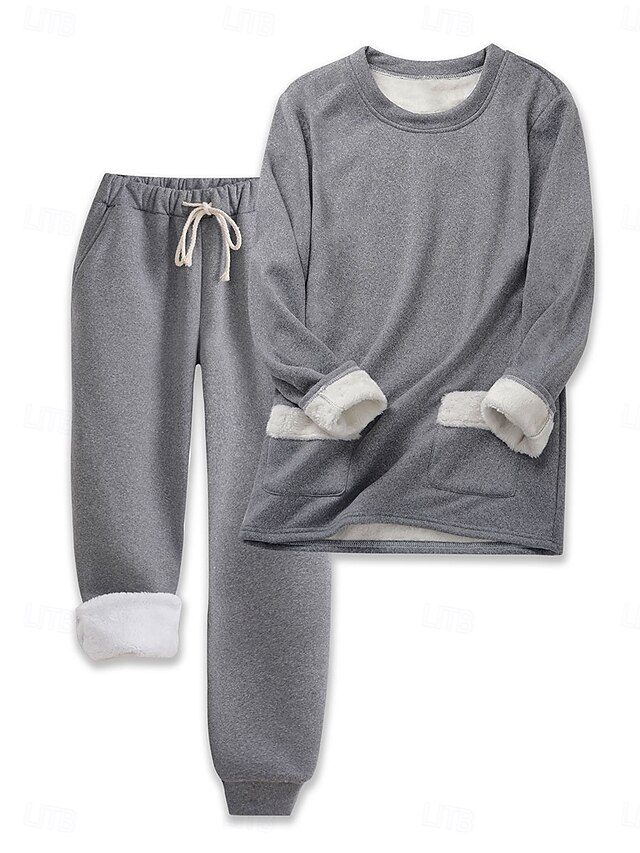 Highlights [Material:] Crafted from a soft and plush polyester fleece, this set offers exceptional warmth and comfort. The interior is lined with fluffy white sherpa, providing enhanced insulation perfect for colder months. [Fit:] Designed with a casual and relaxed fit, this set is ideal for daily wear. Both the top and bottoms have a regular fit that ensures comfort without compromising on style. [Design Highlights:] - [Top:] Features a classic crew neckline with long sleeves, highlighted by warm sherpa-lined cuffs for additional comfort and style. The practical kangaroo pocket at the front is perfect for keeping hands warm or carrying small essentials. - [Bottoms:] Include an elastic waistband with an adjustable drawstring for a tailored fit. The tapered elastic hem ensures the pants stay comfortably in place, with the sherpa lining extending to the ankles for extra warmth. [Occasions:] Perfect for casual relaxation at home during the fall and winter months. This loungewear set is suitable for any laid-back occasion, offering style and coziness whether you're lounging on a weekend or enjoying a quiet day indoors. [Size Range:] Available in sizes S, M, L, XL, and 2XL, ensuring a wide range of fits to accommodate different body types and preferences. Presented in a versatile gray, this loungewear set can easily complement a variety of other clothing items, making it both practical and stylish for at-home comfort.