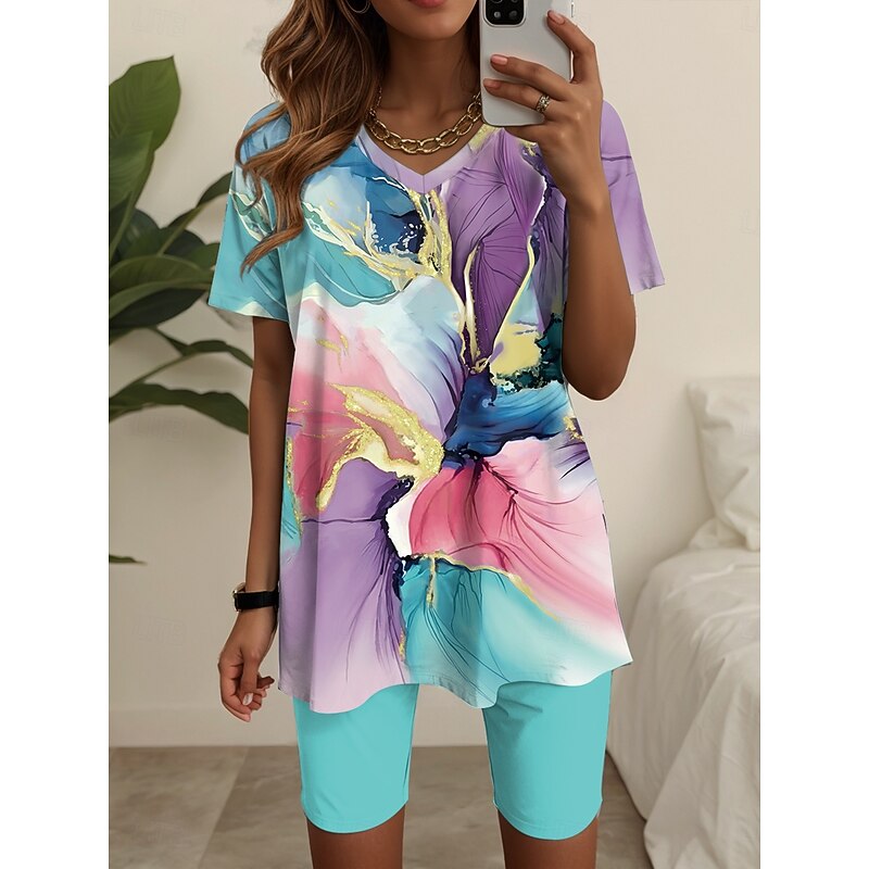 Why Choose Women's 2 Pieces Fashion T Shirt Shorts Sets Short Sleeve V Neck Graphic Geometric Print Daily Casual Daily Blue Green Summer Regular Fit?