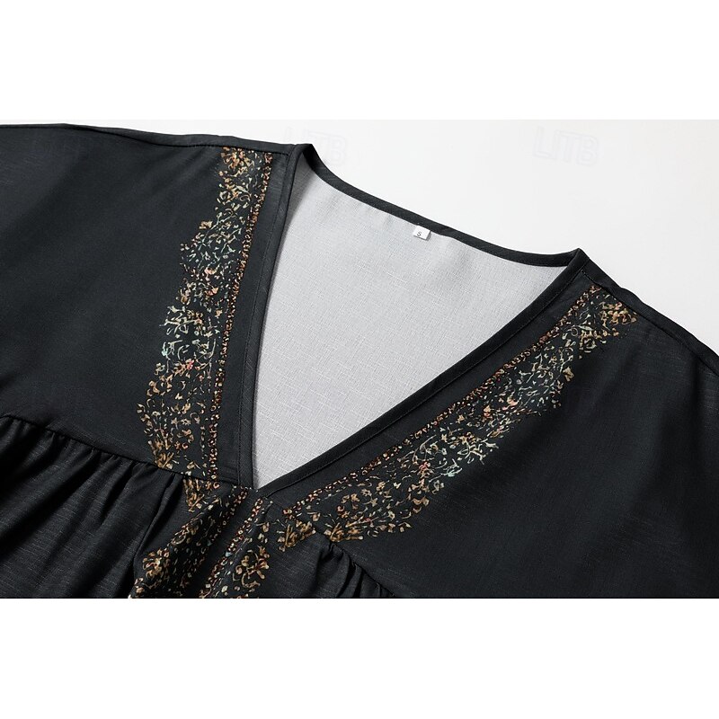 HOT ! Women's Cotton Linen Shirts Western Blouse Plain Bohemia Vintage Boho Long Sleeve V Neck Long Tops Daily Holiday Patchwork Dark Gray Summer