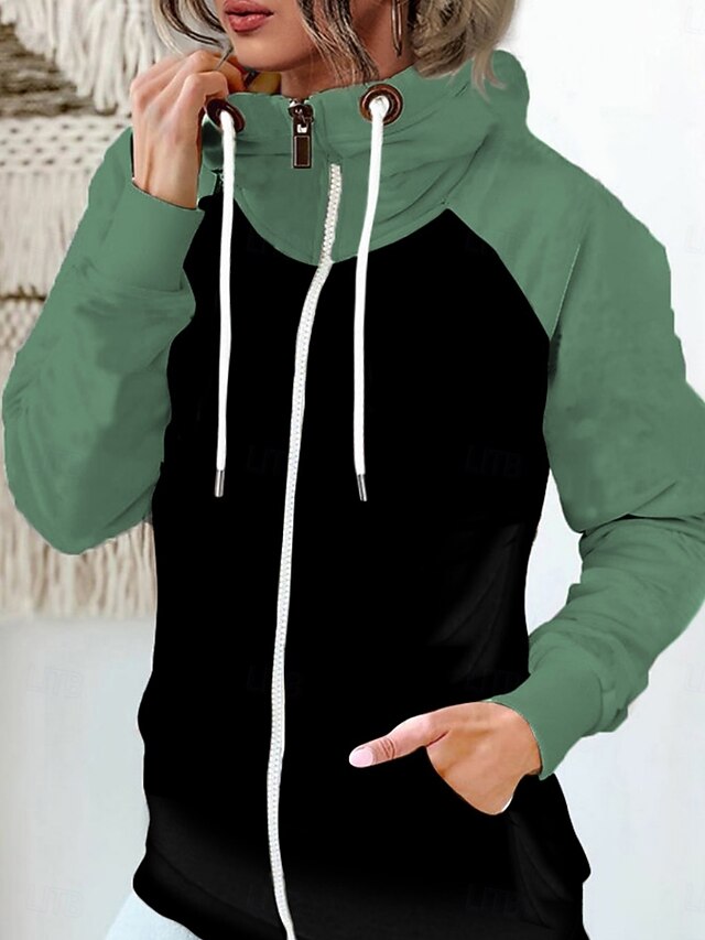 HOT ! Women's Pullover Hoodie Sweatshirt Color Block Casual Long Sleeve Hooded Regular Tops Street Dailywear Zipper Pocket White Red Khaki Army Green Fall Winter