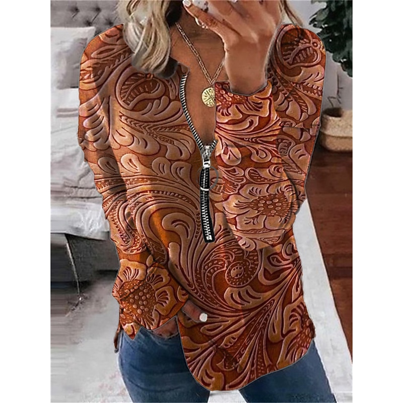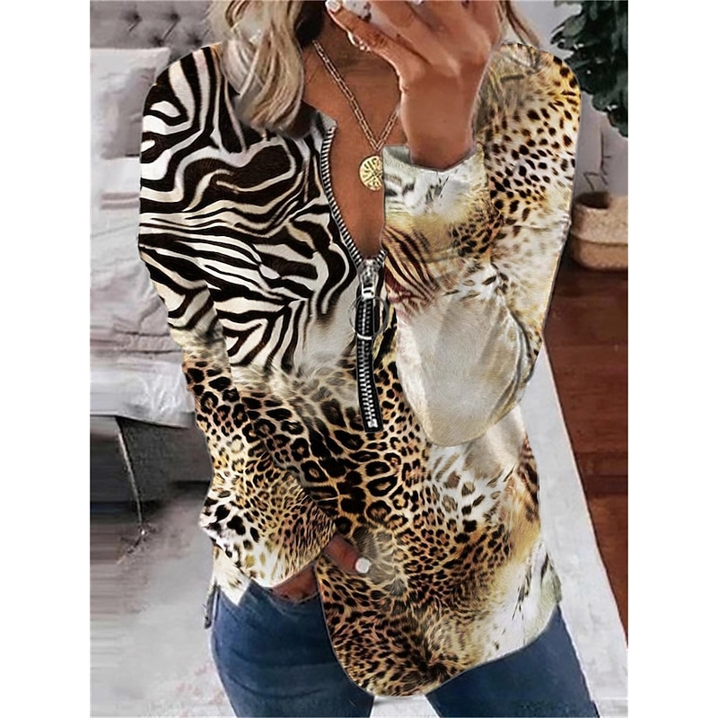 Women's Valentine Heart Sweatshirt Pullover Leopard Casual Sports Round Neck Print Quarter Zip Long Sleeve Black White Yellow Orange Green Fall & Winter