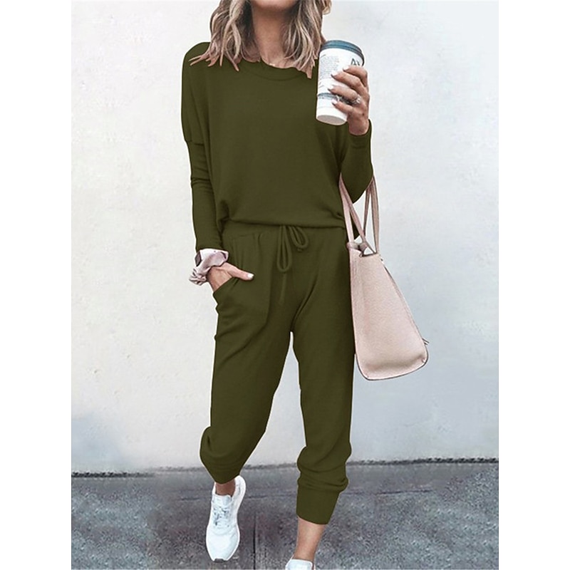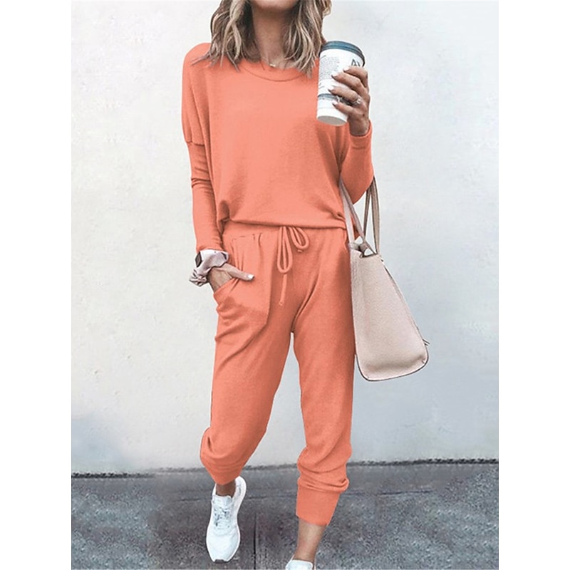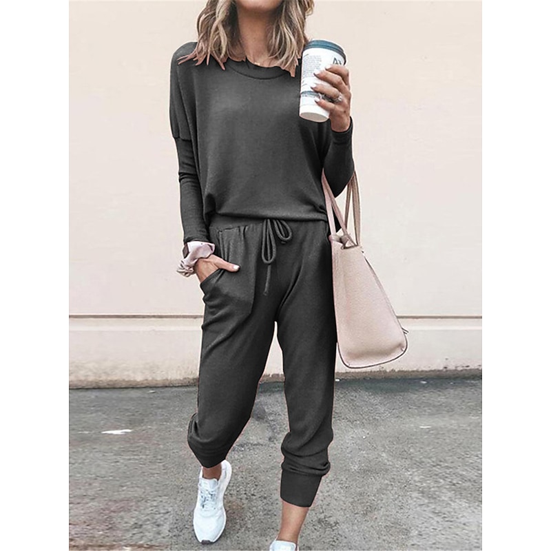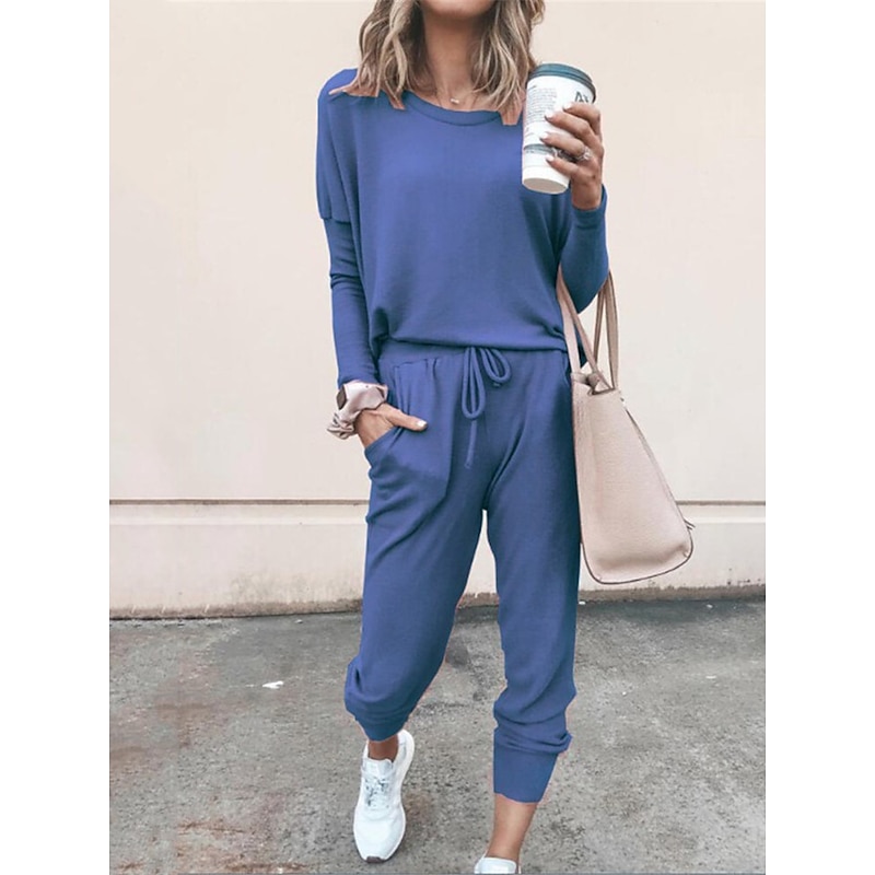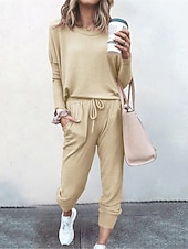Highlights [Fabric] : Crafted from a breathable polyester blend, this pajama set offers a soft touch with micro-elastic properties, ensuring a comfortable fit ideal for lounging or restful sleep. The lightweight fabric makes it perfect for the warmer months of spring and summer. [Fit] : This casual ensemble includes a long-sleeve top with a relaxed, easy-going fit and a crew neckline. The jogger pants feature an elastic waistband with an adjustable drawstring, providing a customized fit that accommodates various body shapes. [Design Highlights] : The pajama set includes functional pockets, and the pants are finished with ribbed cuffs at the ankles for a sporty yet laid-back vibe. The pure color scheme adds a touch of simplicity and elegance. [Occasions] : Designed for daily wear, this pajama set is perfect for home, bed, and casual lounging. Its versatility allows it to seamlessly transition from a comfortable loungewear piece to an outfit suitable for running errands or relaxed outings. [Size Range] : Available in sizes S, M, L, XL, and 2XL, this pajama set caters to a broad range of body types, providing a comfortable and stylish option for adult women.