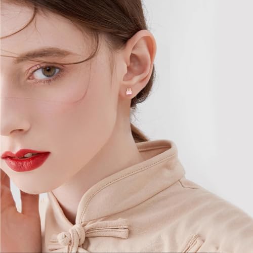HOT ! 20g Birthday Cake Gold Plated Flat Screw Back Small Stud Earrings for Women Minimalist Cute Surgical Steel Happy Birthday Pink Enamel Piercing Sleeper Tiny Studs Hypoallergenic Unique Birthday Gift for Daughter Her