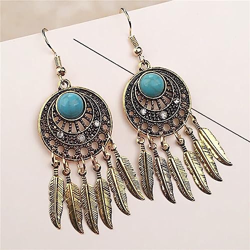 Boho Turquoise Drop Earrings Retro Long Copper Feather Tasse Metal Leaf Dangle Earrings Vintage Country Western Jewelry Cowgirl Ethnic Style Geometric Concert Festival Accessories for Women