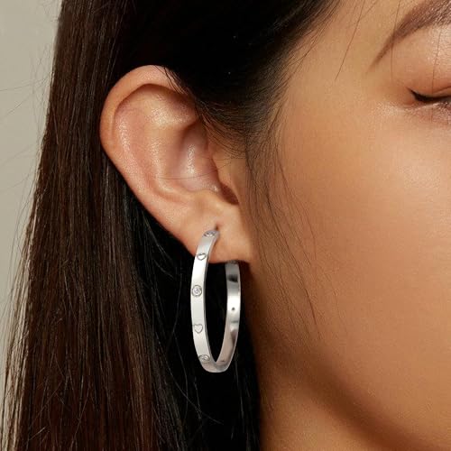 HOT ! OOOPEL Sterling Silver Hoop Earrings for Women Gold Silver Large Hoops with Zirconia and Heart Engraving Hypoallergenic 4mm Wide Big Hoop Earrings for Women (30/40/50/60mm)