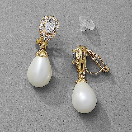 HOT ! Mariell Pearl Gold Clip-On Wedding Earrings for Brides, Pearl and CZ Non-Pierced Drop Bridal Earring
