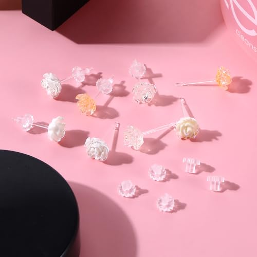 4 Pairs Rose Plastic Earrings, Hypoallergenic Transparent 3D Flower Studs, 4 Styles of Surgical Plastic Earrings for Sensitive Ears, Women's Earrings, Sports Earrings