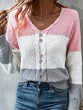 Highlights [Fabric & Material] : Crafted from a soft polyester fabric, this women's sweater features a cable knit style that offers warmth and comfort throughout the cooler seasons. Its micro-elastic quality ensures a comfortable fit for daily wear. [Fit & Style] : The sweater showcases a regular fit with a crew neck design, perfect for a relaxed and casual appearance. Its long sleeves are complemented by ribbed cuffs and a matching ribbed hemline, providing a polished and structured look. [Design Highlights] : The standout feature of this sweater is its stylish color block pattern in shades of pink, adding a modern and vibrant touch to your wardrobe. The large wooden buttons on the button-up front enhance its rustic charm. [Occasions] : Ideal for daily wear during the spring, fall, and winter seasons, this sweater is versatile enough to layer over casual outfits. Whether you're heading to a weekend gathering or enjoying a cozy day at home, this piece adds warmth and style to any setting. [Size Range] : Available in sizes S, M, L, XL, and 2XL, this sweater caters to a wide range of body types, providing a comfortable fit for everyone.