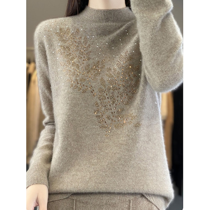 Highlights [Fabric] : Crafted from a high-quality polyester blend, this women's sweater offers a plush, cashmere-like softness that ensures warmth and comfort in the chilly fall and winter months. The micro-elastic material allows for a snug yet comfortable fit. [Fit] : Designed with a regular fit, this sweater features a classic and relaxed silhouette, perfect for layering over other garments during cold weather outings. [Design Highlights] : The pullover showcases a timeless stand collar that provides additional warmth, complemented by long sleeves with ribbed cuffs to enhance the fit. The front is adorned with vertical sequin leaf patterns that add a touch of elegance and sparkle, making it a sophisticated wardrobe staple. [Occasions] : Ideal for daily wear, outdoor adventures, or casual weekend gatherings, this versatile sweater can be dressed up or down, pairing seamlessly with both casual and semi-formal outfits. [Size Range] : Available in a range of sizes (M, L, XL) and colors including Beige, Camel, and Gray, this sweater offers options to suit various style preferences and body types. Perfect for everyday use. High quality materials and excellent craftsmanship ensure long-lasting durability.