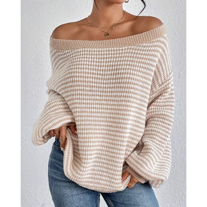 Women's Sweater Pullover Streetwear Casual Striped Off Shoulder Knitted Long Sleeve Regular Tops Knit Holiday Going out Weekend Black Red Fall Winter 13