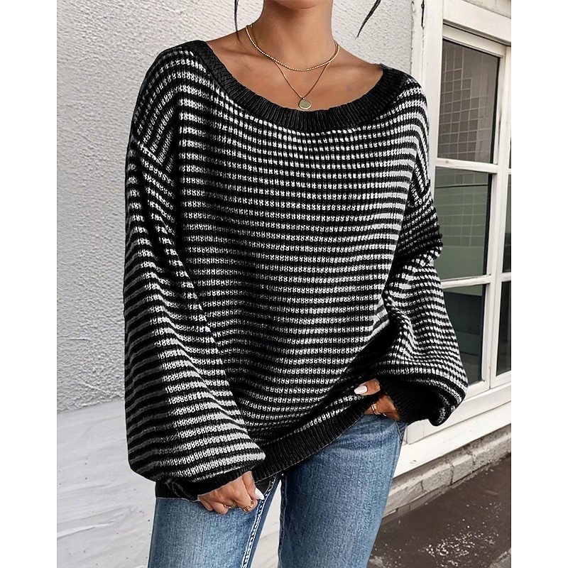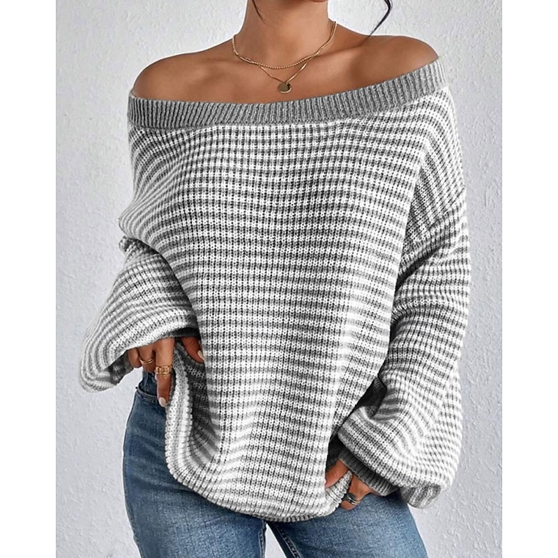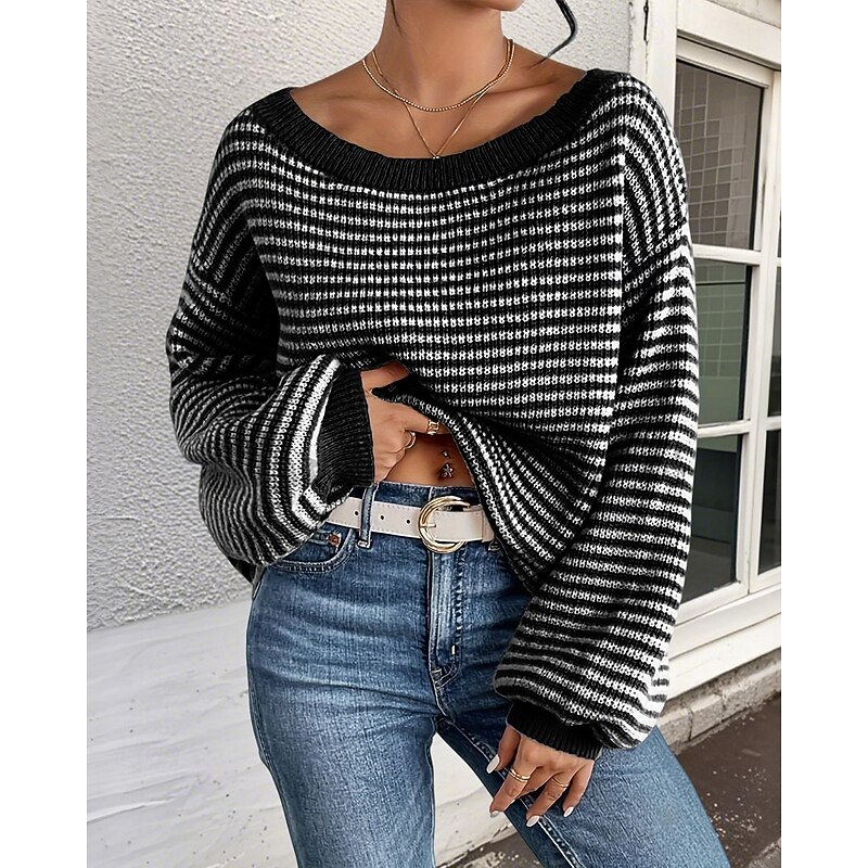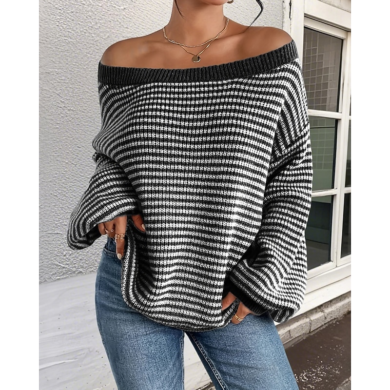 Women's Sweater Pullover Streetwear Casual Striped Off Shoulder Knitted Long Sleeve Regular Tops Knit Holiday Going out Weekend Black Red Fall Winter 15