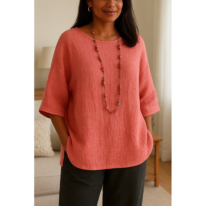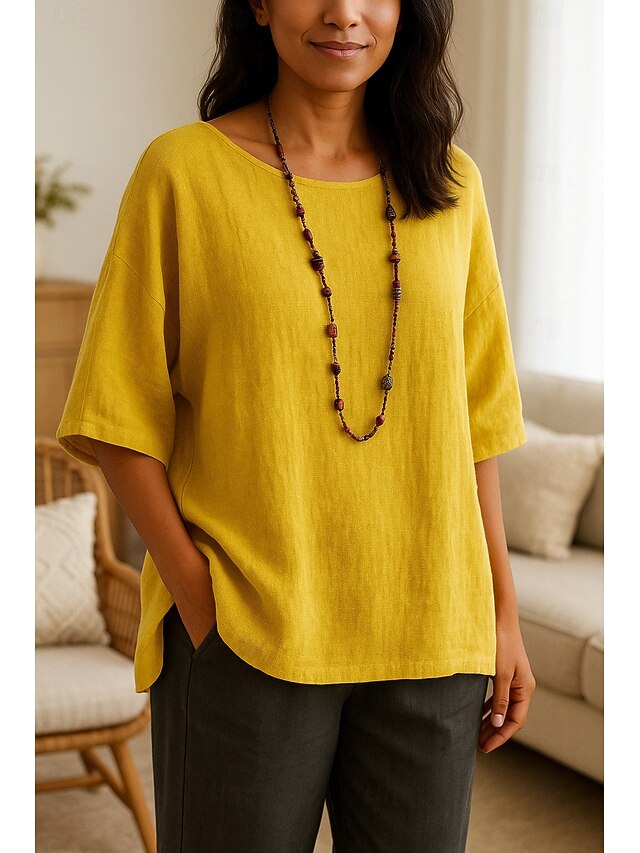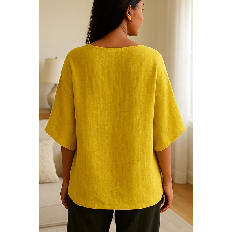 More information about Women's Shirt Cotton Linen Shirt Plain Daily Stylish Basic 3/4 Length Sleeve Crew Neck Regular Tops Work Daily Holiday Yellow Pink Spring Fall