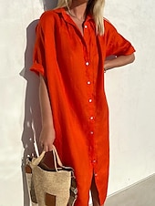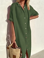 More information about Women's Midi Dress Linen-Inspired Dresses Shirt Dress Casual Dress Cotton Linen Dress Casual Daily Loose Fit Plain Short Sleeve Shirt Collar ArmyGreen Black Red Blue Summer Spring Fall