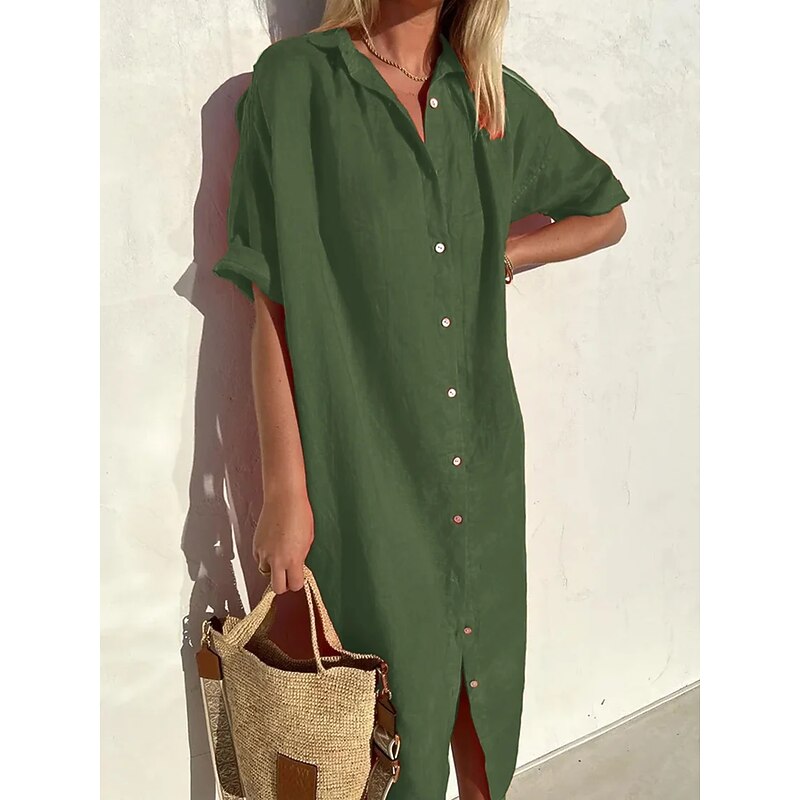 Women's Midi Dress Linen-Inspired Dresses Shirt Dress Casual Dress Cotton Linen Dress Casual Daily Loose Fit Plain Short Sleeve Shirt Collar ArmyGreen Black Red Blue Summer Spring Fall 11