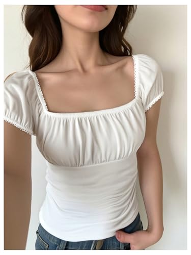More information about SOLY HUX Girl's Square Neck Short Sleeve T-Shirt Y2K Kawaii Lace Trim Tee Tops Coquette Aesthetic Clothes