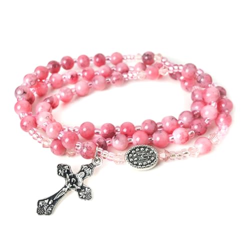 Item width: 6 millimetersMaterial: AcrylicMetal type: ZincClasp type: Lobster ClaspGem type: Created PearlVirgin Mary Marbled Pink and Faux Pearl Acrylic Rosary and 5 Decade Rosary Bracelet Set by Catholic Heirlooms. Includes a Prayer Card.Magnificently exquisite faux pearl Our Father beads on the Rosary. Pray the Rosary Everywhere You Go with the Beautiful Rosary Bracelet. Adjustable to fit all sizes.Ornately detailed Virgin Mary centerpiece in antique silver finish. Bonito Beautiful Stone Rosary and Virgin Mary Bracelet.Beautiful victorian alloy crucifix in antique bronze finish on this beautiful rosary. The Rosary Bracelet is a full 5 decade rosary to pray anywhere you go.Designed exclusively by Catholic Heirlooms in California, USA, a Catholic family owned small business. We recommend getting your Rosaries and Catholic items blessed by a Priest, Deacon or Bishop. Perfect for everyday use. High quality materials and excellent craftsmanship ensure long-lasting durability.