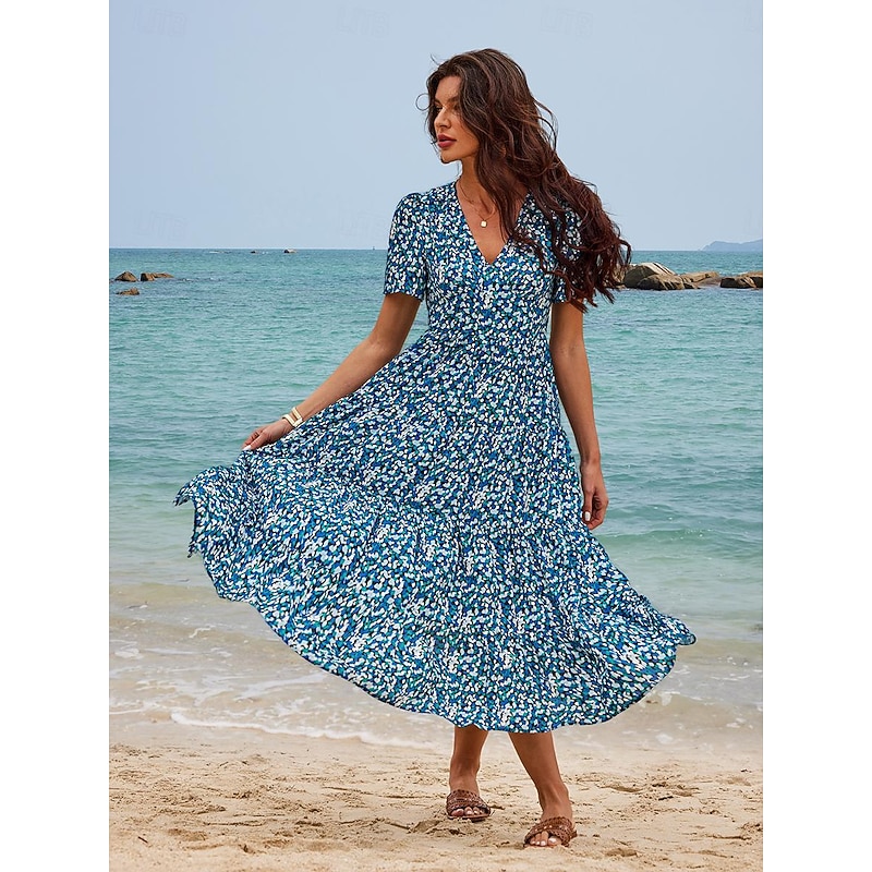 More information about Women's Mid-Length Dress Short Sleeve V-neck Floral Print Bohemian Style Comfortable Beach Vacation Wear Blue White Summer Spring Clothing Apparel