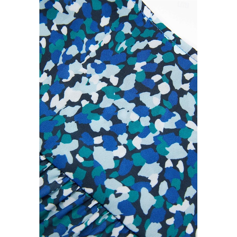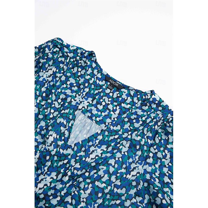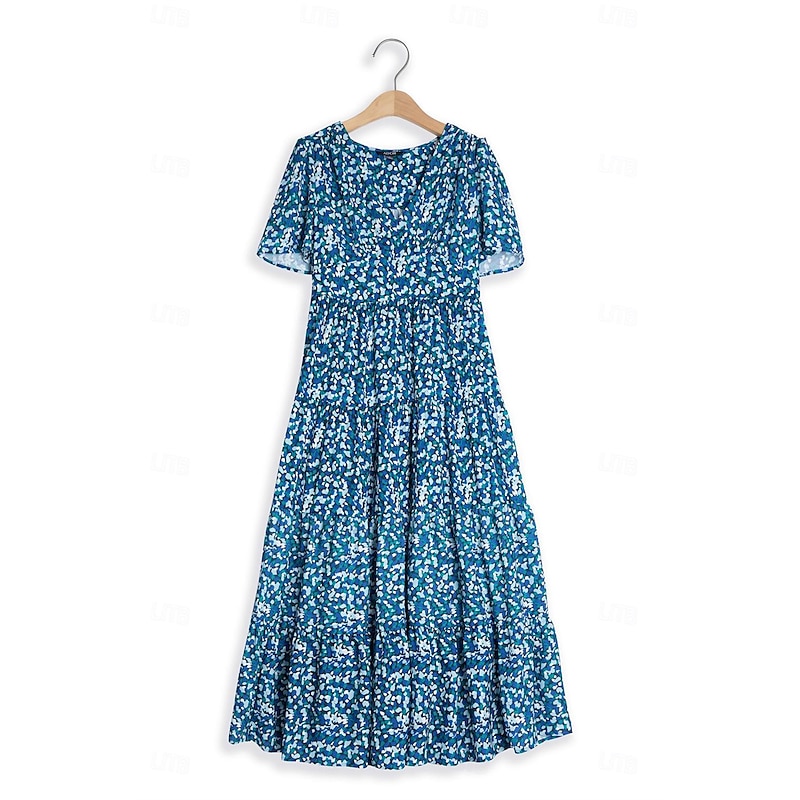 : Featuring a vibrant ditsy floral pattern, the dress is adorned with a tiered V-neck and short sleeves, adding a touch of femininity and sophistication. The slightly fitted waist enhances the figure, while the playful floral print in shades of blue, green, and white captures a lively, summery vibe.
