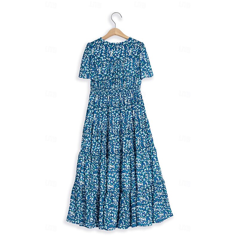 Women's Mid-Length Dress Short Sleeve V-neck Floral Print Bohemian Style Comfortable Beach Vacation Wear Blue White Summer Spring Clothing Apparel