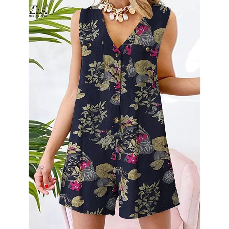 More information about Women's Normal Romper Active Floral Sleeveless V Neck Buttons High Waist Vacation Daily Regular Fit Yellow Red Navy Blue Summer