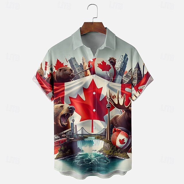 More information about Canada Day Men's Flag Maple Leaf Beaver Shirt Summer Shirt Button Up Shirt Short Sleeve Fashion Casual Holiday Summer Spring Turndown 3D Print Collared Shirts Front One Pocket Blue