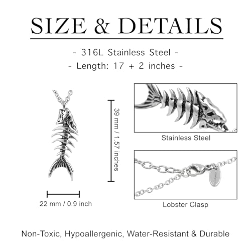 HOT ! Controse Silver-Toned Stainless Steel Fish Bones Necklace with Pendant (17" - 19" Adjustable Chain)
