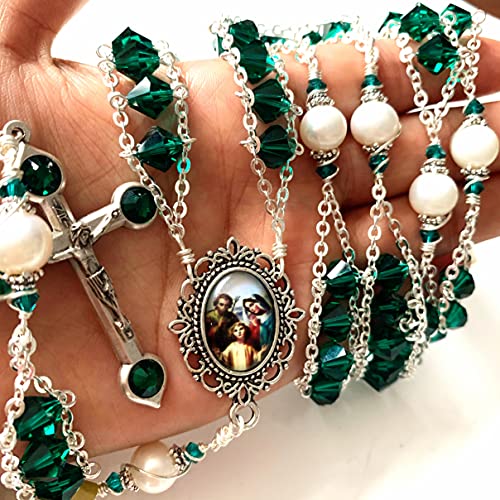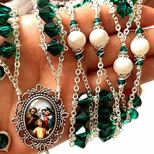 • elegantmedical Ladder to Heaven Green Crystal & AAA10MM Pearl Beads Catholic Rosary Cross crucifix Necklace gift