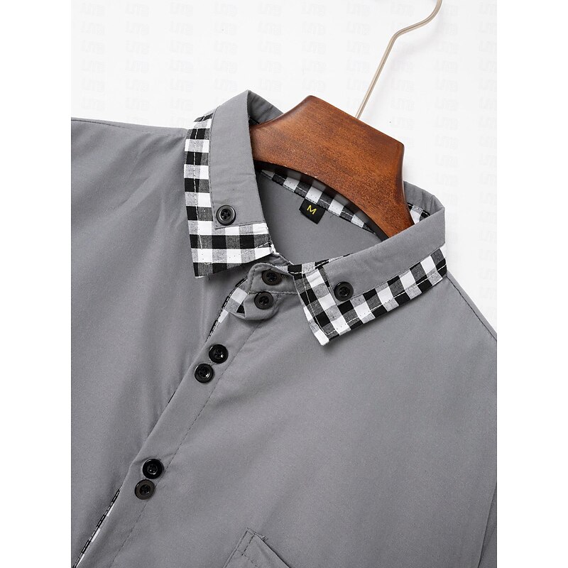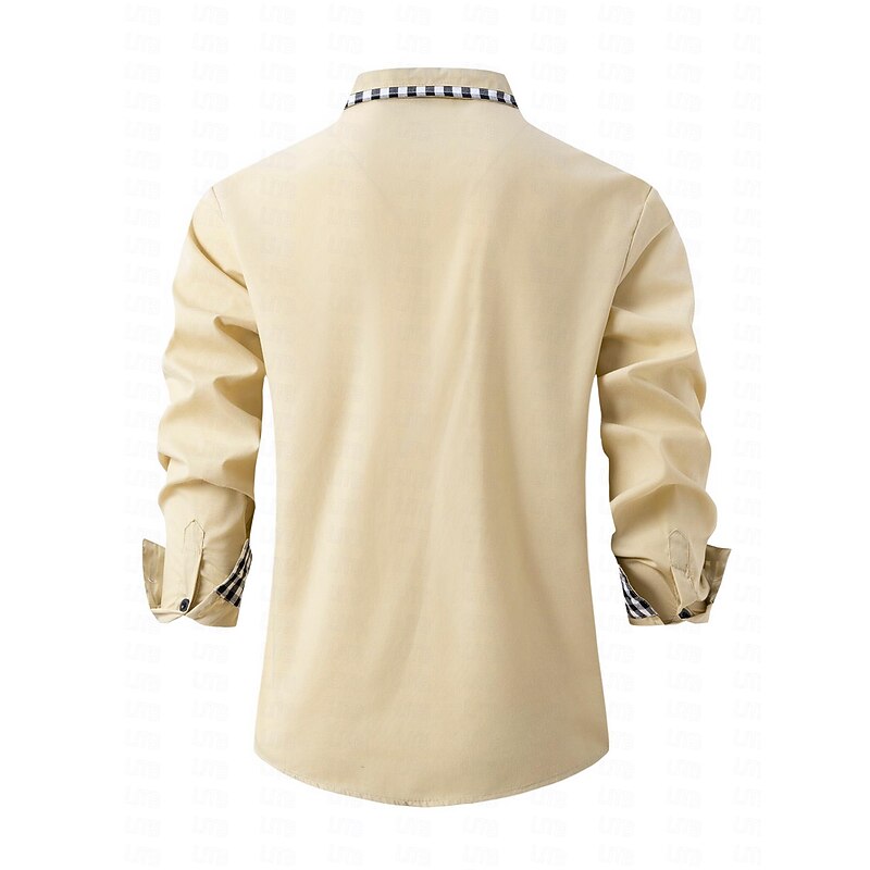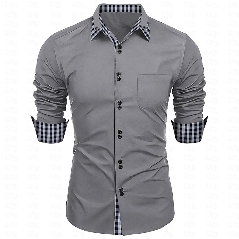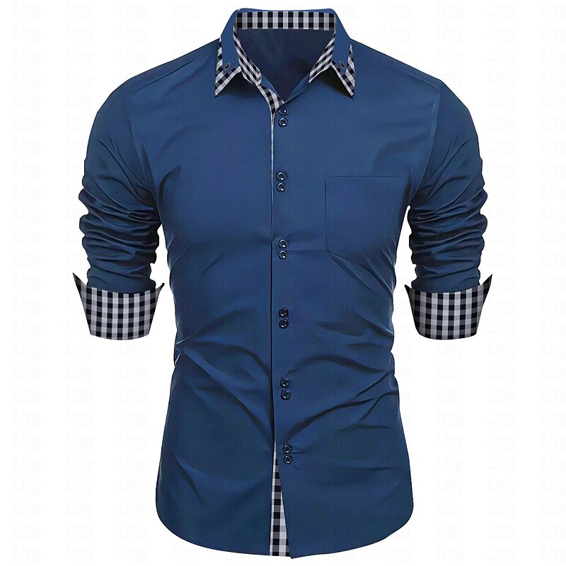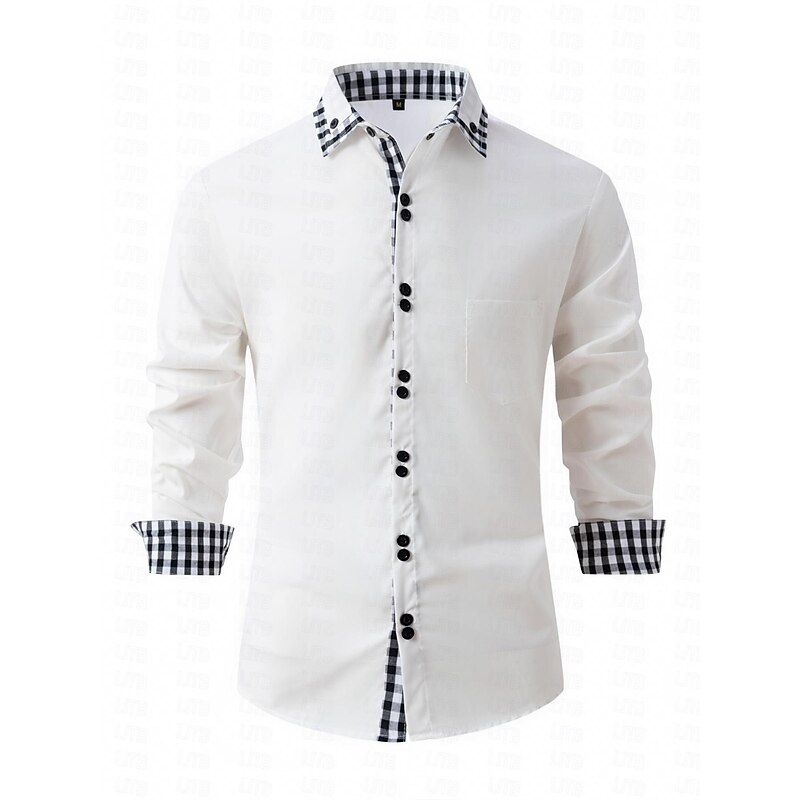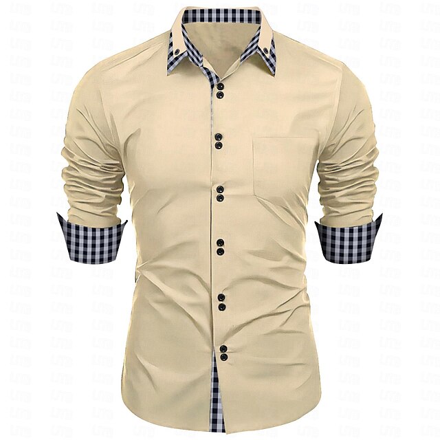 Highlights [Fabric] : Crafted from a high-quality cotton and poly-cotton blend, this men's shirt offers comfort and breathability, ensuring a soft feel against the skin while providing durability for long-lasting wear. [Fit] : The dress shirt features a modern fit that flatters the silhouette, offering a sleek and stylish look suitable for various body types. [Design Highlights] : This shirt showcases a sophisticated turndown neckline and a color block pattern in solid tones. It includes contrasting elements with a checkered pattern inside the collar, button placket, and cuffs, adding a unique touch to the overall design. The button-down front and long bishop sleeves with adjustable cuffs provide versatile styling options for different occasions. [Occasions] : Ideal for vacation, street outings, casual weekends, and other social events. Whether you're going out for a relaxed day or attending a semi-formal gathering, this shirt complements your fashion needs seamlessly. [Size Range] : Available in a variety of colors including Burgundy, White, Black, Pink, Dark Blue, Dark Grey, Blue, and Khaki, this shirt comes in sizes ranging from S to 3XL, accommodating a wide range of preferences and ensuring a suitable fit for everyone.