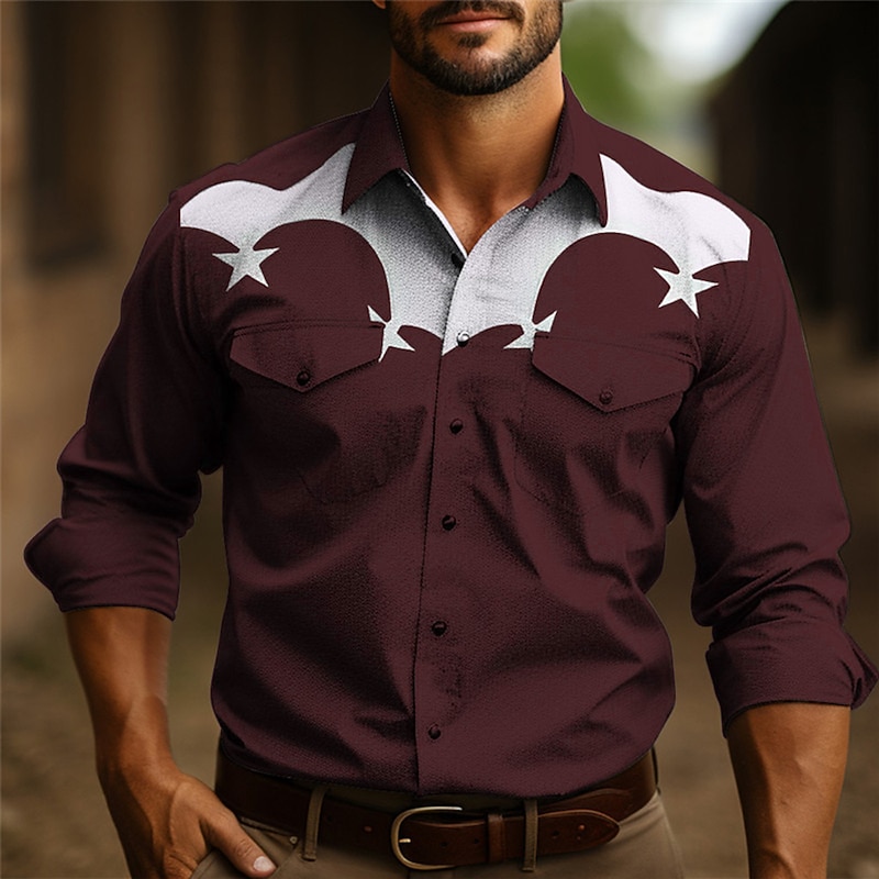 Men's Star Shirt Western Shirt Cowboy Shirt Long Sleeve Casual Outdoor Street Casual Daily Fall & Winter Turndown Buttons Print Black Burgundy Dark Navy Sky Blue Olive 1