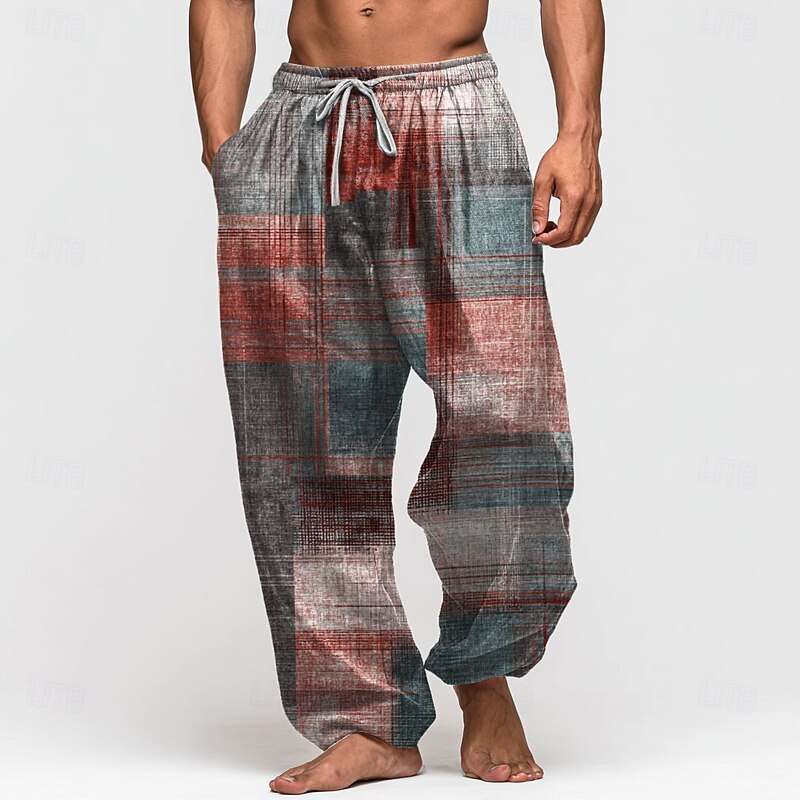Men's Color Block Patchwork Trousers Baggy Pants Casual Pants Mid Waist Vintage Outdoor Vacation Elastic Drawstring Waist Linen-Like Pants with Pockets Summer Spring Fall 3D Print Red Blue Green 9