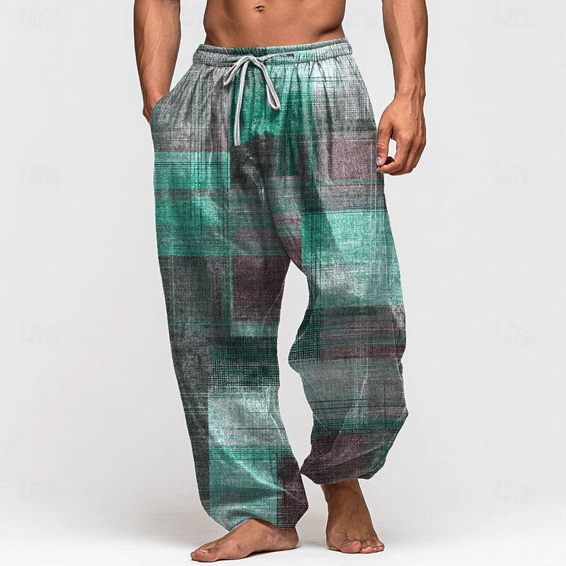 Men's Color Block Patchwork Trousers Baggy Pants Casual Pants Mid Waist Vintage Outdoor Vacation Elastic Drawstring Waist Linen-Like Pants with Pockets Summer Spring Fall 3D Print Red Blue Green 7
