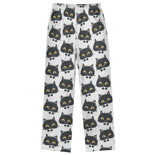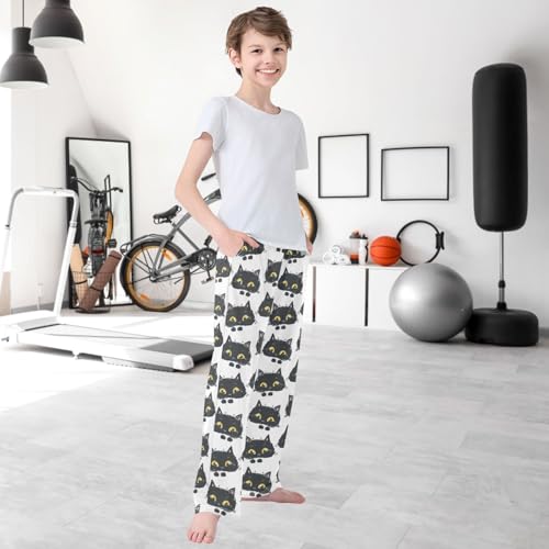 Boy's Pj Pants Black Cat Yellow Eyes Doodle Lounge Bottoms Elastic Kids Sweatpants Joggers with Pockets Size 6-14