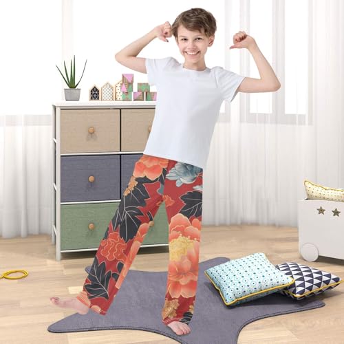 ZZXXB Peony Flowers Pattern Boys Long Pants Soft Trousers Elastic Waist Kids Lounge Bottoms with Pockets S-XL