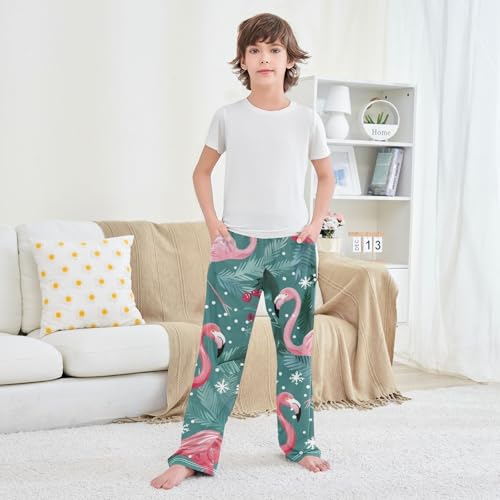 HOT ! Xmas Flamingo Berry Boys Long Pants Soft Trousers Elastic Waist Kids Lounge Bottoms with Pockets S-XL