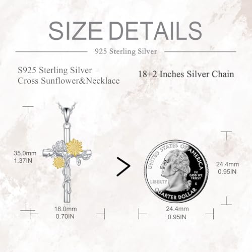 Material: Sterling SilverMetal type: Sterling SilverClasp type: LobsterChain type: RoloGem type: No GemstoneItem type name: Pendant Necklaces❤Design Deal❤ -- Two sunflowers wrapped around a cross symbolize that people should maintain a positive attitude in life, pursue brightness and happiness. At the same time, this cross sunflower necklace can be paired with any clothing, looking simple and generous❤Material❤ -- 925 Sterling Silver and Hypoallergenic, Especially for those with sensitive skin❤Size❤ -- The size of pendant is 17*32mm. Suitable size and comfortable to wear❤Packet❤ -- Comes with the charm box, suitable for yourself, friends, wife, business partner, on Birthday, Christmas, Thanksgiving Day, Mother's Day, Anniversary Day❤Satifaction Service❤ -- We aim for 100% customer satisfaction . We are pleasure to provide high quality jewelry and the best customer service. If there are any problems with the purchase, please contact us, we will help to fix the problem Perfect for everyday use. High quality materials and excellent craftsmanship ensure long-lasting durability.