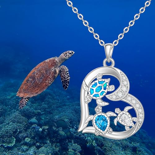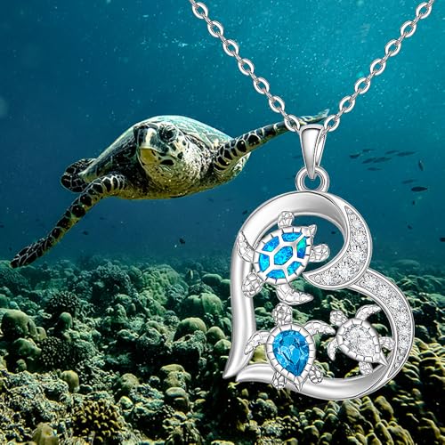 Turtle Necklace for Women 925 Sterling Silver Opal Sea Turtle Pendant Necklace Heart Ocean Necklace Gifts for Beach Lovers, Mother's Day, and Ocean-Themed Events