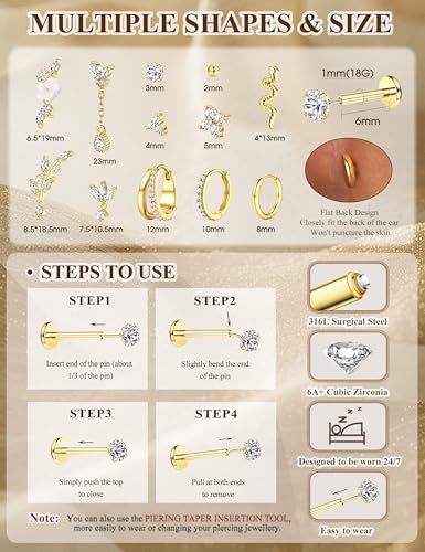 Material: Stainless SteelMetal type: Stainless SteelGem type: Cubic zirconia【Attention】: The flat back push pin earrings set is Sold Individually, Not In Pairs. We offer 12pcs of different styles gold earrings, one order includes 9pcs of threadless flatback stud earrings and 3pcs hoop earrings for customers to mix and match for layering.【Threadless Flat Back Earrings】: The unique push-in design makes putting them on a breeze! Compared to traditional threaded flat back styles, you only need to move your fingers to put the ear piercing jewelry on and take off in one second. No need to twist your flat back, and no need to worry about your back slipping or falling off. The slim flat back ensures comfortable all-day wear.【Hypoallergenic Flat Back Studs】: These gold earrings made of 316L surgical stainless steel suited for people with sensitive skin. Our threadless nose stud undergo rigorous testing to be nickel and lead-safe and non-irritating. The push in earrings stud with smooth polished surface are safe and durable. Dainty tiny earrings are lightweight, even if you wear several earrings stacks together, won’t put any strain on the ear.【Multiple Uses】:Whether you choose to wear them as cartilage earrings, helix piercing jewelry, daith piercing jewelry, conch piercing jewelry, tragus piercing jewelry, nose studs, labret piercing etc. these earrings provide both convenience and comfort. Wear them either individually or in layers. Of course, our single earring set come with exquisite gift box and cleaning cloth, making them the perfect gift for friends and family.【Flatback Stud Earrings Size】: Women cartilage earring post thickness: 18G(1.0mm)/20G(0.8mm) , bar length: 6mm. Small hoop earrings inner diameter:12/10/8mm. Color:14K gold plated and sliver tone. (Hoops are suitable for ears,18 gauge and 20 gauge is more suitable for your nose piercing and most ear piercings). You can make selections size and combinations them however you like based on your ear piercings and other piercings.Tips: If push in nose stud top feels loose, then you just need to remove the pin and slightly bent the pin more than 20 degree when insert the pin. (The pins may appear slightly blackened due to the process technology, which is designed to increase friction and prevent the pin from falling out. Please feel free to wear them). If you have more questions about these stack earrings, please feel free to contact us. Perfect for everyday use. High quality materials and excellent craftsmanship ensure long-lasting durability.