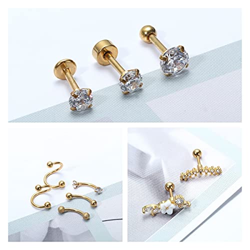 • šŸ’ŽEarrings for Cartilage Piercing: 27pcs gold tone ear piercing jewelry set, packaging with a velvet bag. 3 pairs cartilage stud earrings + 4pcs cartilage earring hoops + 4pcs forward helix piercing jewelry + 4pcs tragus piercing jewelry + 3pcs rook piercing jewelry + 2pcs daith piercing jewelry + 2pcs conch piercing jewelry + 2pcs twisted spiral barbell. Cute ear cartilage earrings for women.