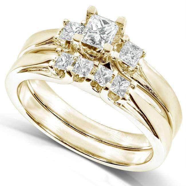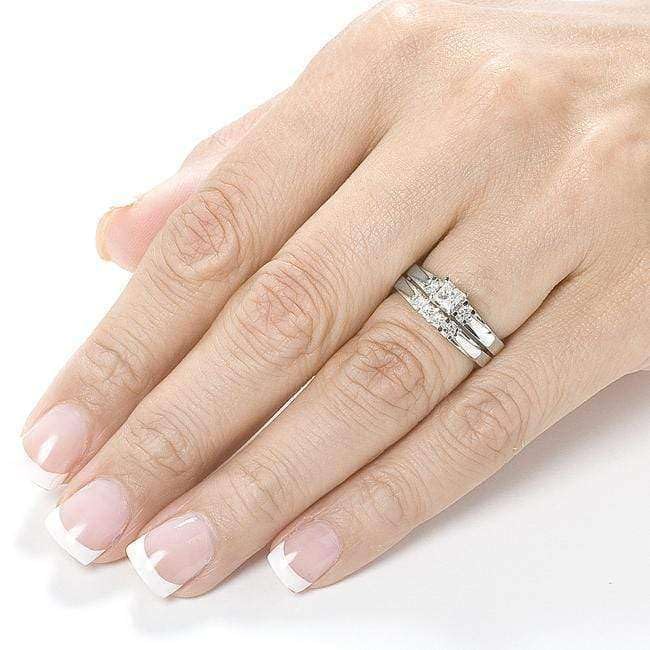 - Set comes with one three stone diamond engagement ring and one matching four stone diamond wedding band
