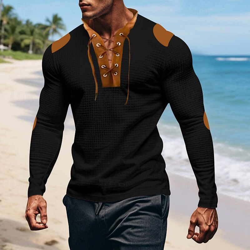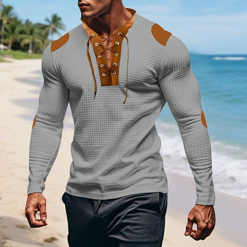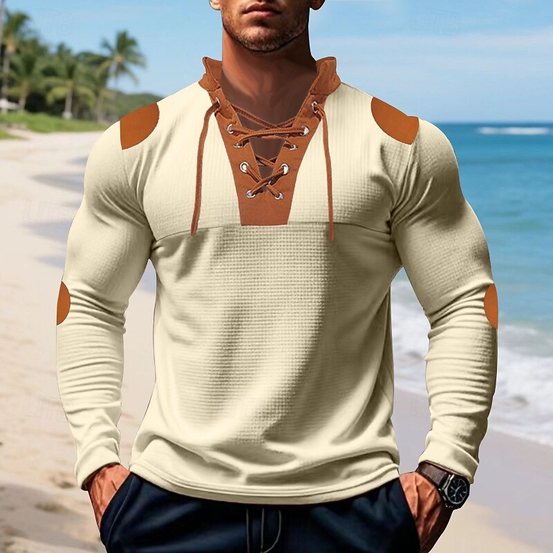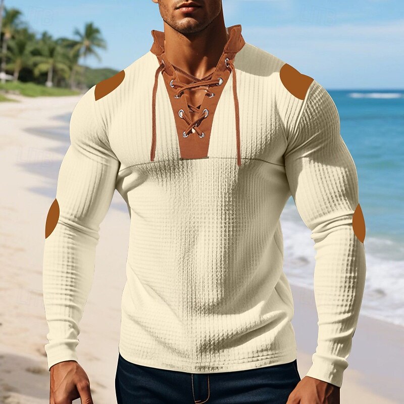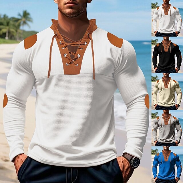 More information about Men's T Shirt Tee Waffle Knit Tee Tee Top Long Sleeve V Neck Spring Fall Color Block Fashion Designer Basic Lace up Vacation Street Going out Apricot Black White Top Tee for Men