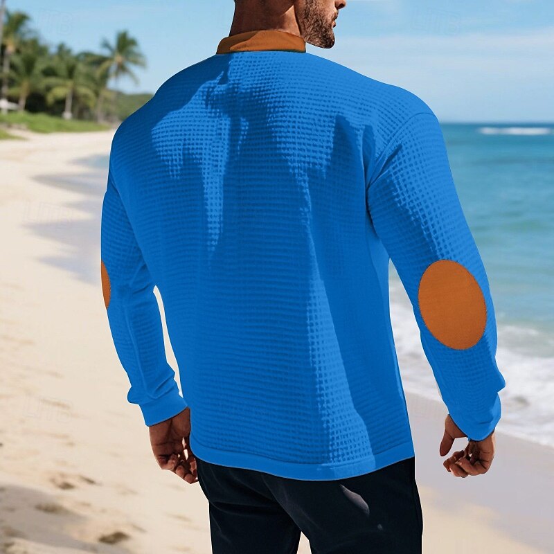 Highlights - Perfect for spring and fall seasons - Made from high-quality polyester fabric - Features long sleeves for added warmth - Designed for men with a basic yet stylish look - Ideal for vacation and casual occasions - Stylish color block pattern with a trendy lace-up design - V-neckline adds a touch of sophistication to the outfit
