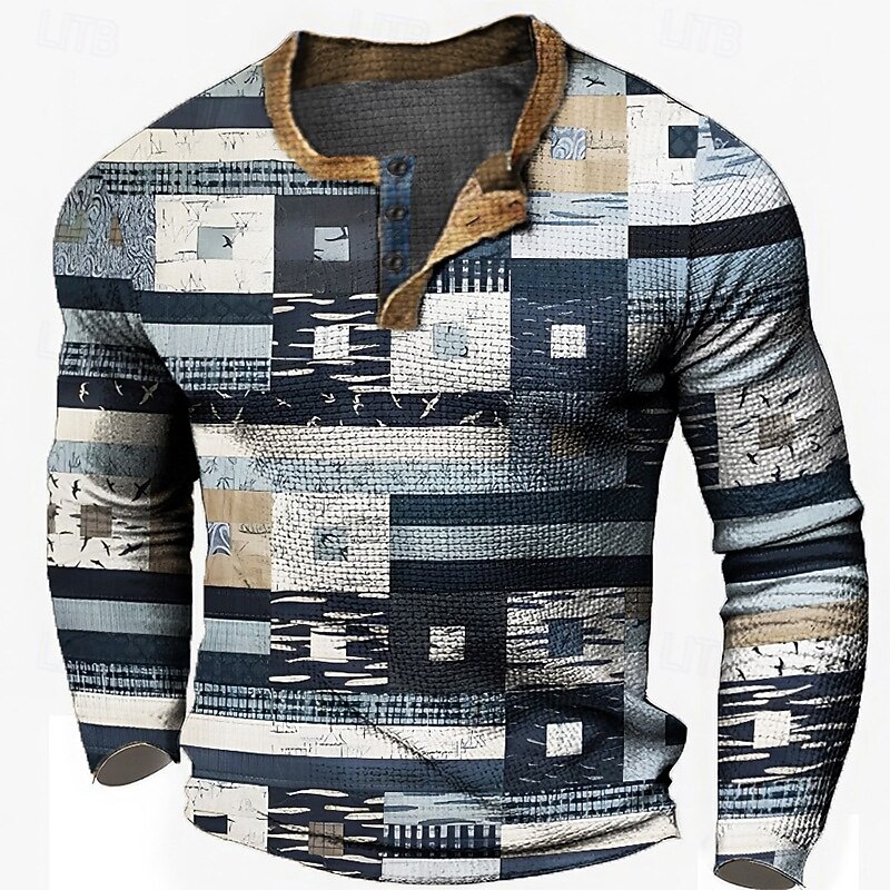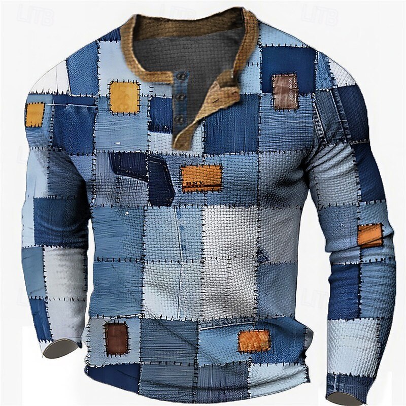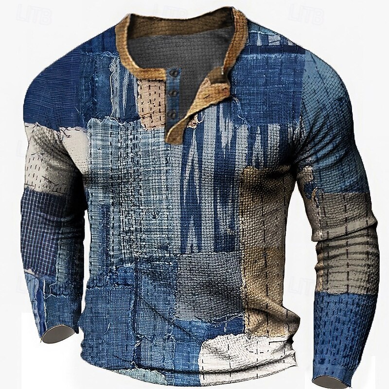 : Featuring a henley neckline with button closures, this shirt blends casual and sophisticated elements. The contrasting brown trim offers a warm accent against the blue palette, while the intricate plaid and graphic patterns create a distinctive 3D effect. The patchwork-inspired design lends a vintage, retro appeal.
