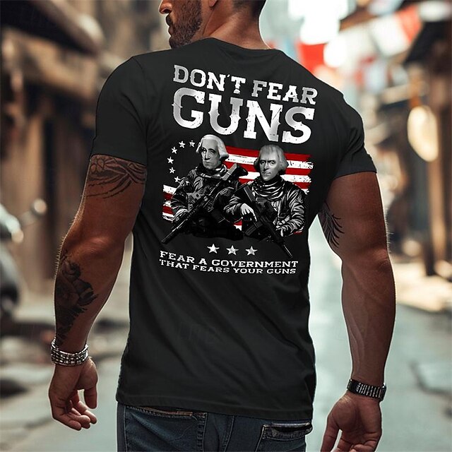 Highlights [Fabric and Fit:] Crafted from 100% breathable cotton, this men's t-shirt ensures comfort and durability. The micro-elastic fabric provides a regular fit, allowing ease of movement, making it perfect for casual wear during warmer months. [Design Highlights:] This t-shirt features a striking graphic design on the back, displaying bold messages like DON'T FEAR GUNS alongside stylized historical figures against an American flag backdrop. The classic crew neck and short sleeves add to its timeless, relaxed style. [Occasions:] Ideal for a variety of settings, this t-shirt is perfect for outdoor sports, holidays, and casual outings. It combines statement-making style with comfort, making it a versatile addition to any wardrobe. [Size Range:] Available in a wide range of sizes from S to XXL, ensuring a comfortable fit for adults of different body types. This men's t-shirt, designed by Ador, is not only a piece of clothing but also a statement, combining quality crafting with bold, eye-catching graphics. Whether you're out for a sports event or a casual holiday gathering, this tee is the perfect choice. Perfect for everyday use. High quality materials and excellent craftsmanship ensure long-lasting durability.